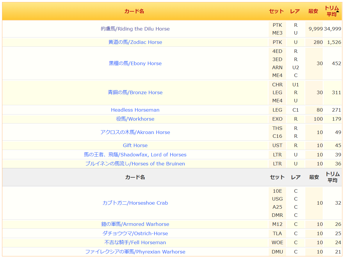 今年は馬年ということで、馬の種族で価格を出したかったのですが、そんな機能は無かったので、カード名にHorseを含む一覧で値段を見てみたいと思います!