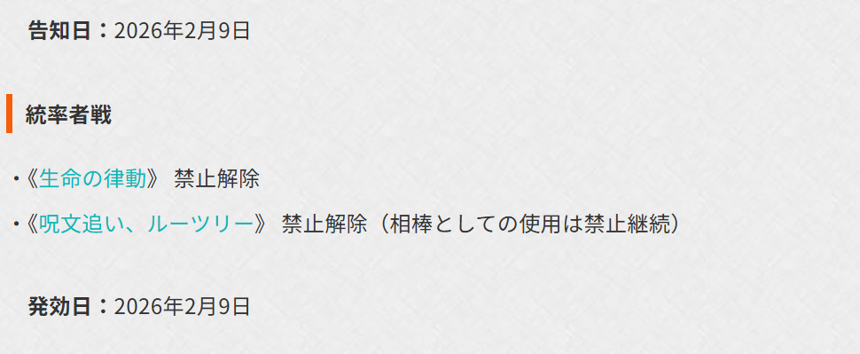 【禁止制限告知】スタン、モダン、パウパー、レガシー変更なし!統率者にて生命の律動、ルーツリー解禁!ほか 公式 2026.02.10 公式より禁止制限告知が公開されたのでご紹介いたします。 公式該当ページ これによると、2026年2月9日にて以下フォーマットにおいて次の変更がアナウンスされています。 各フォーマットにおいて、変更なし・変更の理由が公式リンクにて解説されています。気になる方はぜひ公式をチェックしましょう。 続いて統率者です。 公式該当記事 解除された理由や、禁止されてない強いカードの理由なども記述があるので、ぜひチェックしましょう!